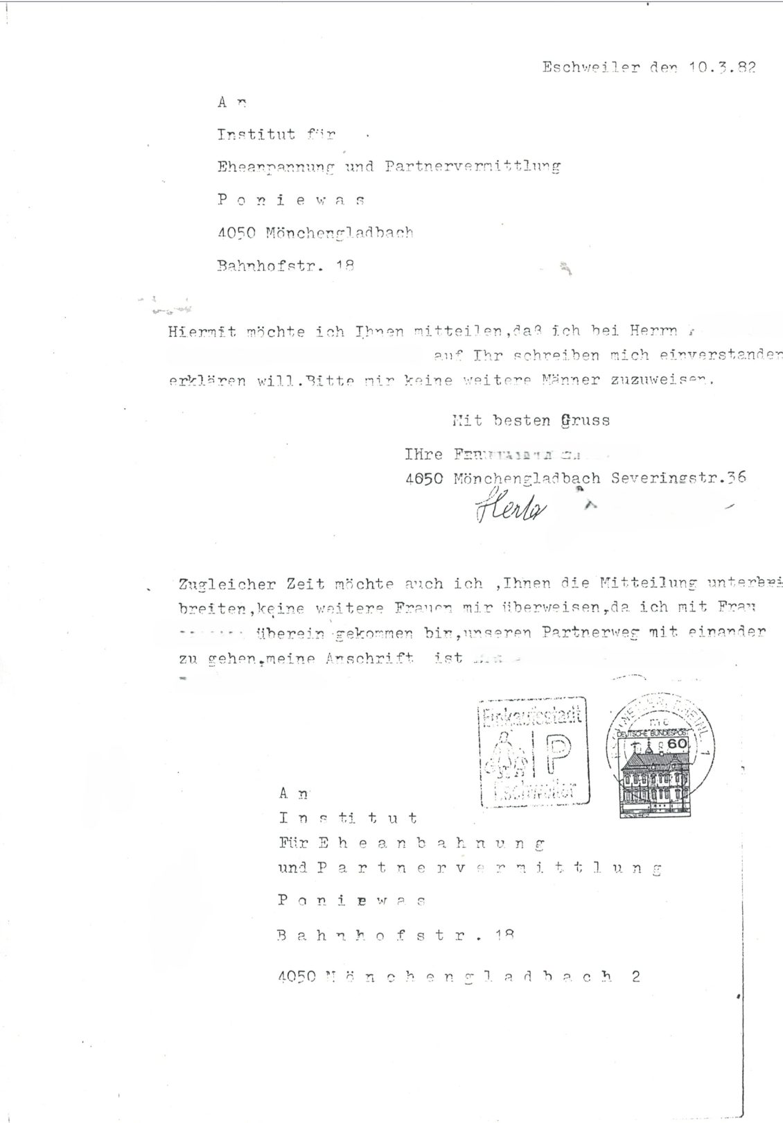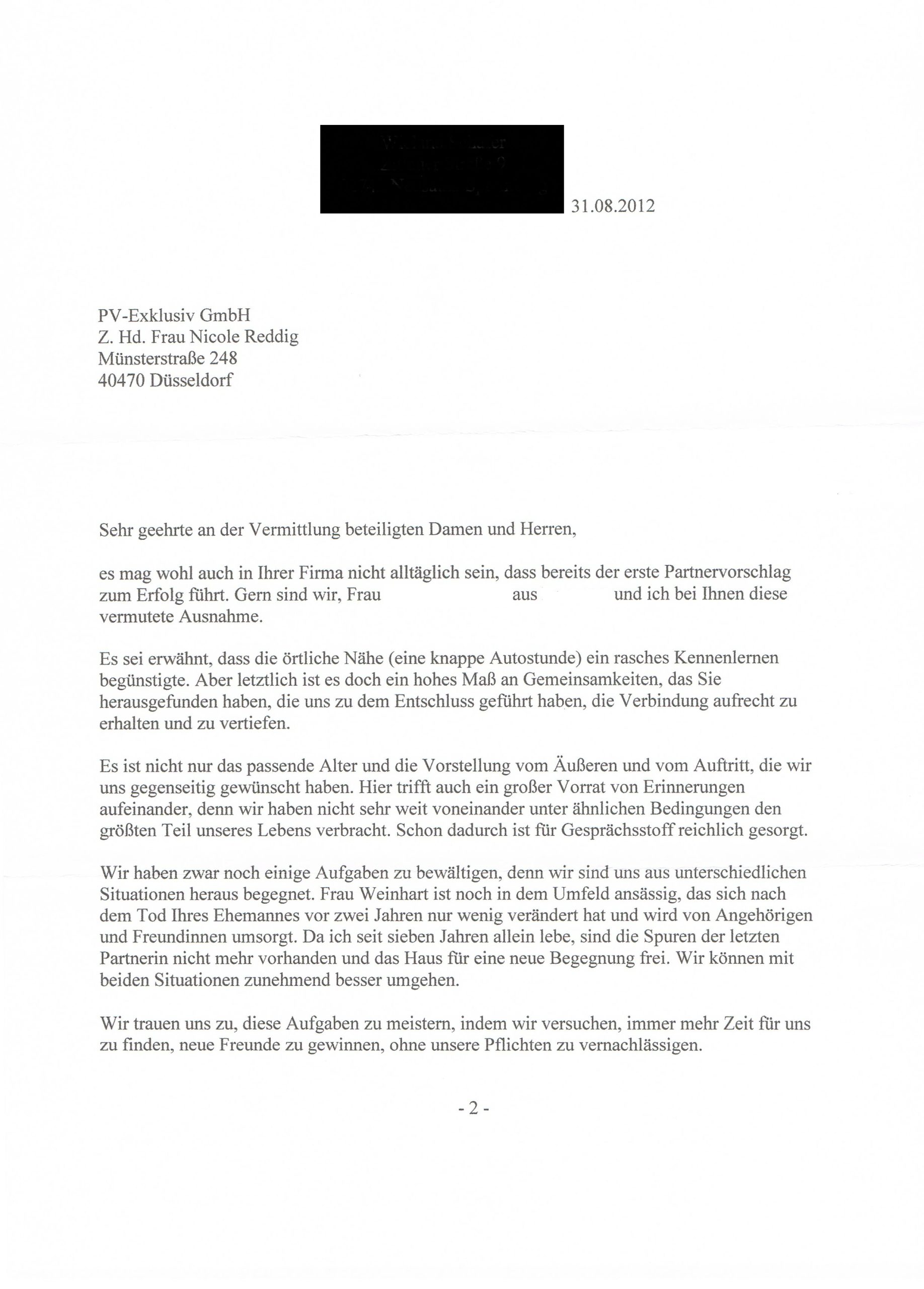 Die oben gezeigten historischen Schreiben stammen aus den Jahren 1972 bis 2000 und dokumentieren Rückmeldungen von Menschen, die durch frühere Vermittlungstätigkeiten der Familie Poniewas zueinander gefunden haben. Diese Dokumente beziehen sich auf historische Aktivitäten der Familie und stehen nicht im Zusammenhang mit der heutigen Partnervermittlung PV-Exklusiv.