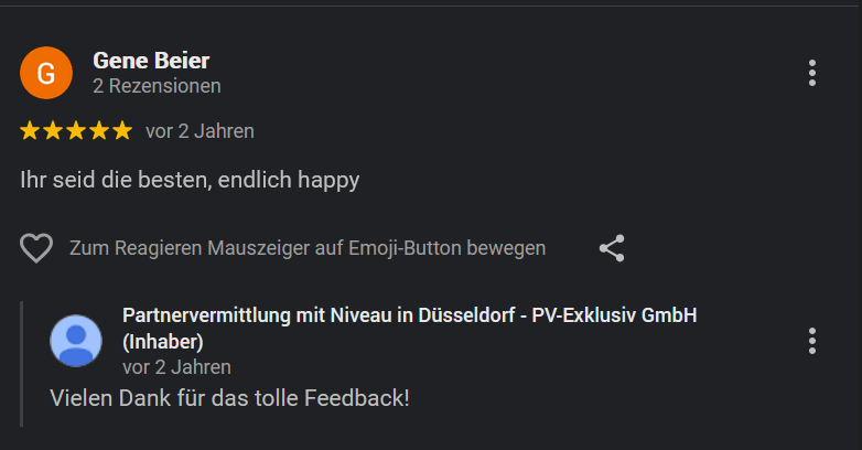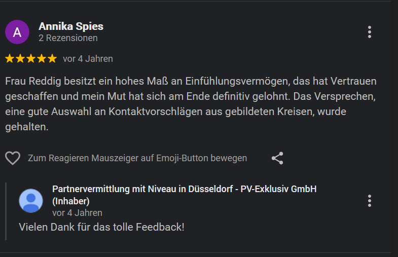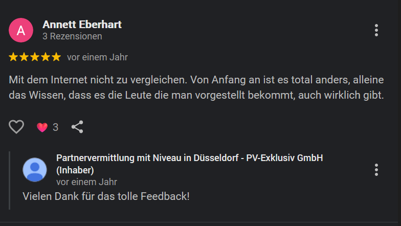 Gerade deshalb kommt es in diesem sensiblen Bereich gelegentlich vor, dass einzelne Rückmeldungen kritischer ausfallen. Bei der Partnersuche spielen Erwartungen und persönliche Vorstellungen eine große Rolle. In unseren Gesprächen weisen wir deshalb immer darauf hin, dass eine Partnervermittlung Wünsche berücksichtigen kann – sie kann jedoch keinen Menschen „erschaffen“, der exakt einer gedanklichen Wunschliste entspricht.